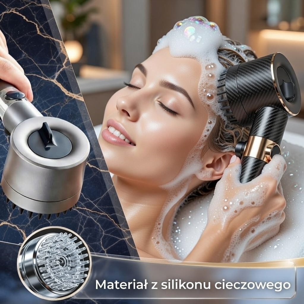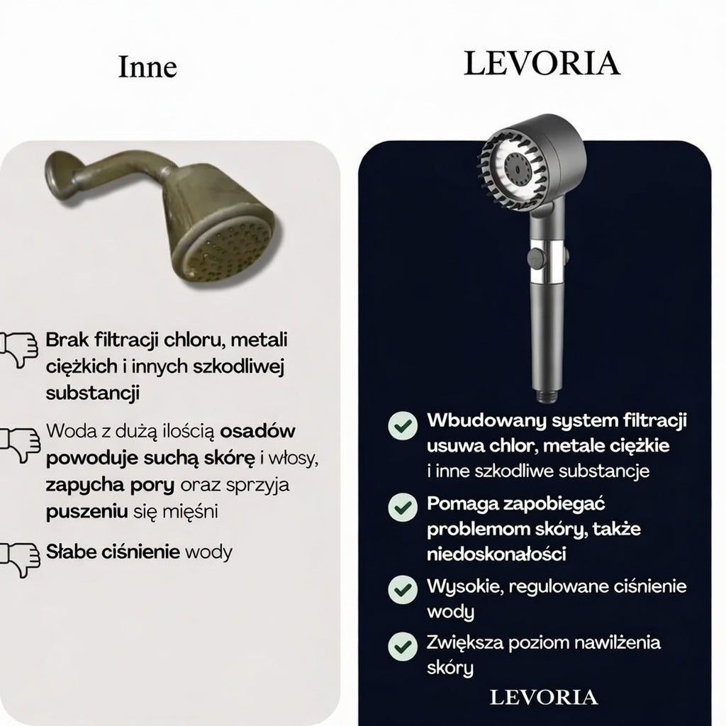 ak. Wielowarstwowy system filtracji pomaga redukować chlor, osady, rdzę oraz cząsteczki metali ciężkich. Dzięki temu woda jest delikatniejsza dla skóry i włosów.